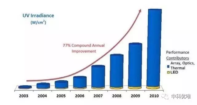UV LED固化機(jī)系統(tǒng)供應(yīng)商來說,他們需要在更快到市場但更少差別化的燈,和更長時(shí)間到市場但能最大化UV功率之間做出選擇。從這個(gè)角度來說,兩個(gè)供應(yīng)商所采用的即使是同一批LED,但最終所達(dá)到的性能表現(xiàn)卻可能會有很大不同。