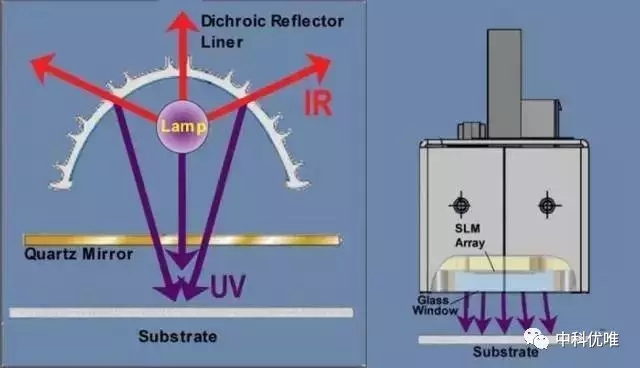 基于最終的應(yīng)用需求,光學(xué)工程師必須決定應(yīng)該采用何種形狀、形式以及材質(zhì)來最好地利用LED的獨(dú)特性能,然后還需要注意LED是一種泛光形式的光,而不像汞燈模式中紫外光被反射罩反射并指向特定的點(diǎn)并具有一定的聚焦長度。下圖標(biāo)出了傳統(tǒng)汞燈和UV LED燈在這一點(diǎn)上面的不同。
