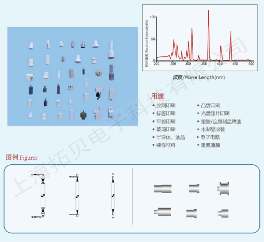 uv燈管)由高品質的純石英管材制造而成,使紫外線能高程度及大量的穿透,其弧長度/發光長度可由5厘米至300厘米不等,常見功率為每厘米30W至200W,超大功率UV燈一般在每厘米200W或以上操作,該燈光譜有效范圍在350-450nm之間,主波峰為365nm,有700多個品種,功率由100w-25kw.UV燈的壽命一般指其能維持足夠的能量進行操作的時間,在此期間其能量逐漸衰減直至低于可接受的范圍為止,一般情況標準的UV燈能放射足夠的UV能量達800小時.UV固化廣泛用于竹木地板、家具、裝飾材料、印刷、印鐵制罐、塑膠涂裝、標牌、電路板、光盤等行業;也是半導體、電子元件、液晶等粘接固化的理想光源.