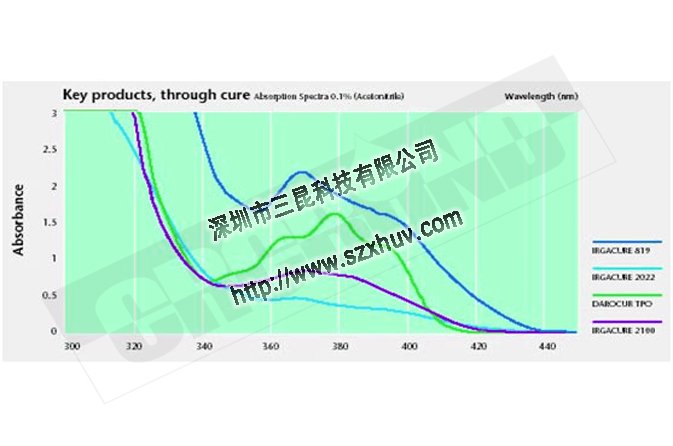 固化機理中,都是由光引發劑吸收紫外能量,產生活性基團,從而引發體系的聚合反應。換句話說,光引發劑是否或者吸收哪些波段以及吸收了多少紫外能量,產生了多少活性基團,是UV膠是否固化,固化效果好不好的關鍵因素之一。下圖是幾種常見光引發劑的吸收光譜圖,可以看到不同引發劑在不同波段的吸收強度是有很大差異的。